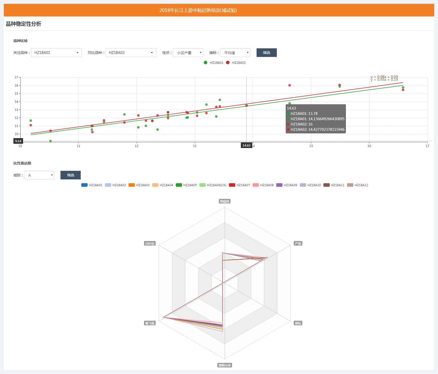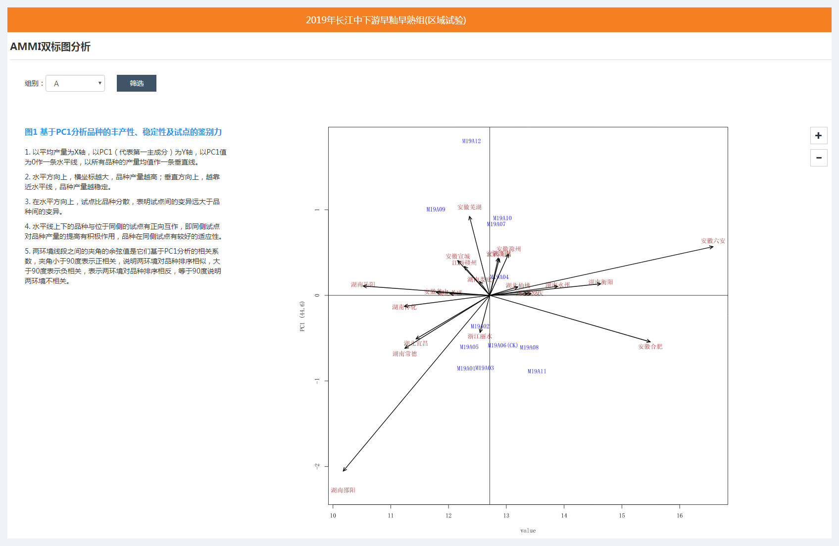 华智特有模型分析方案,丰富的分析方法:ANOVA分析,SHUKLA分析,AMMI分析、GGE双标图分析、BLUP育种值分析、品种稳定性分析、区域适应性分析等。