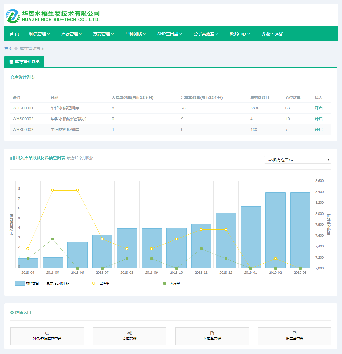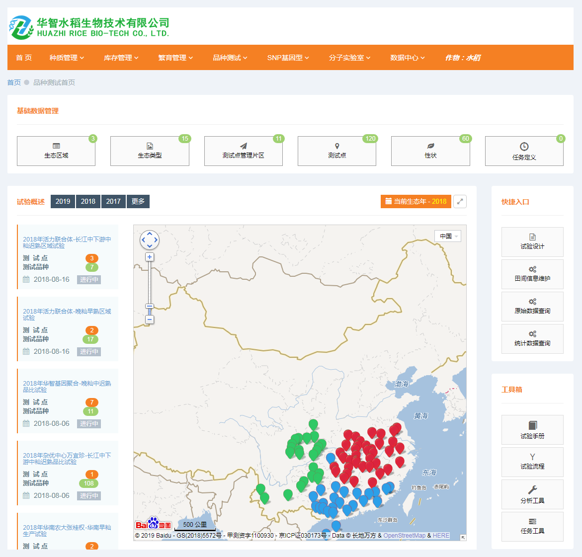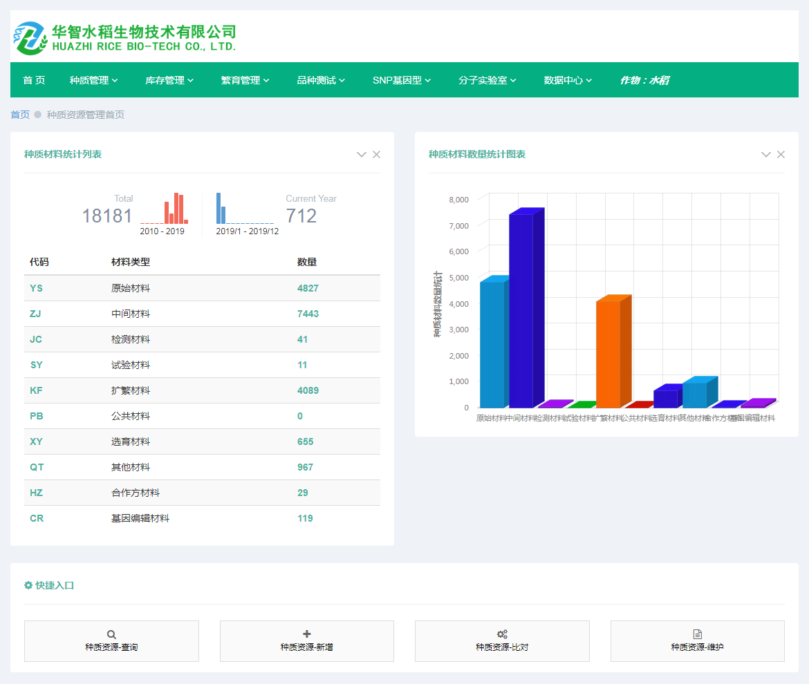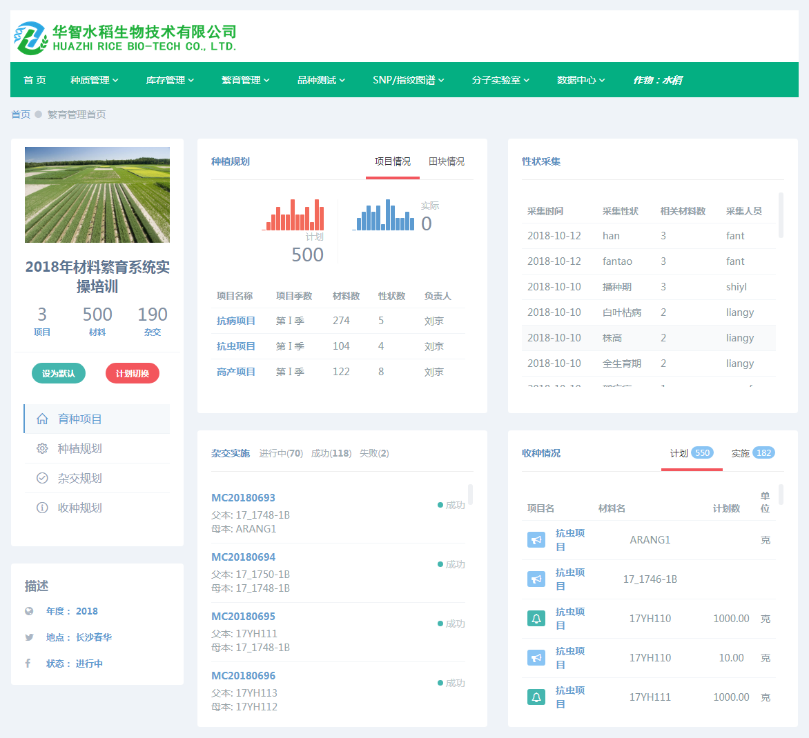 主要包含种质库存、繁育活动、品种测试、分子育种、移动应用、系统管理八大核心模块。
